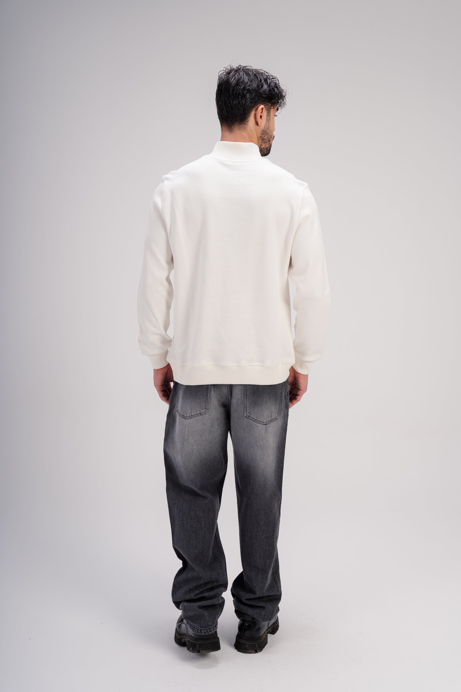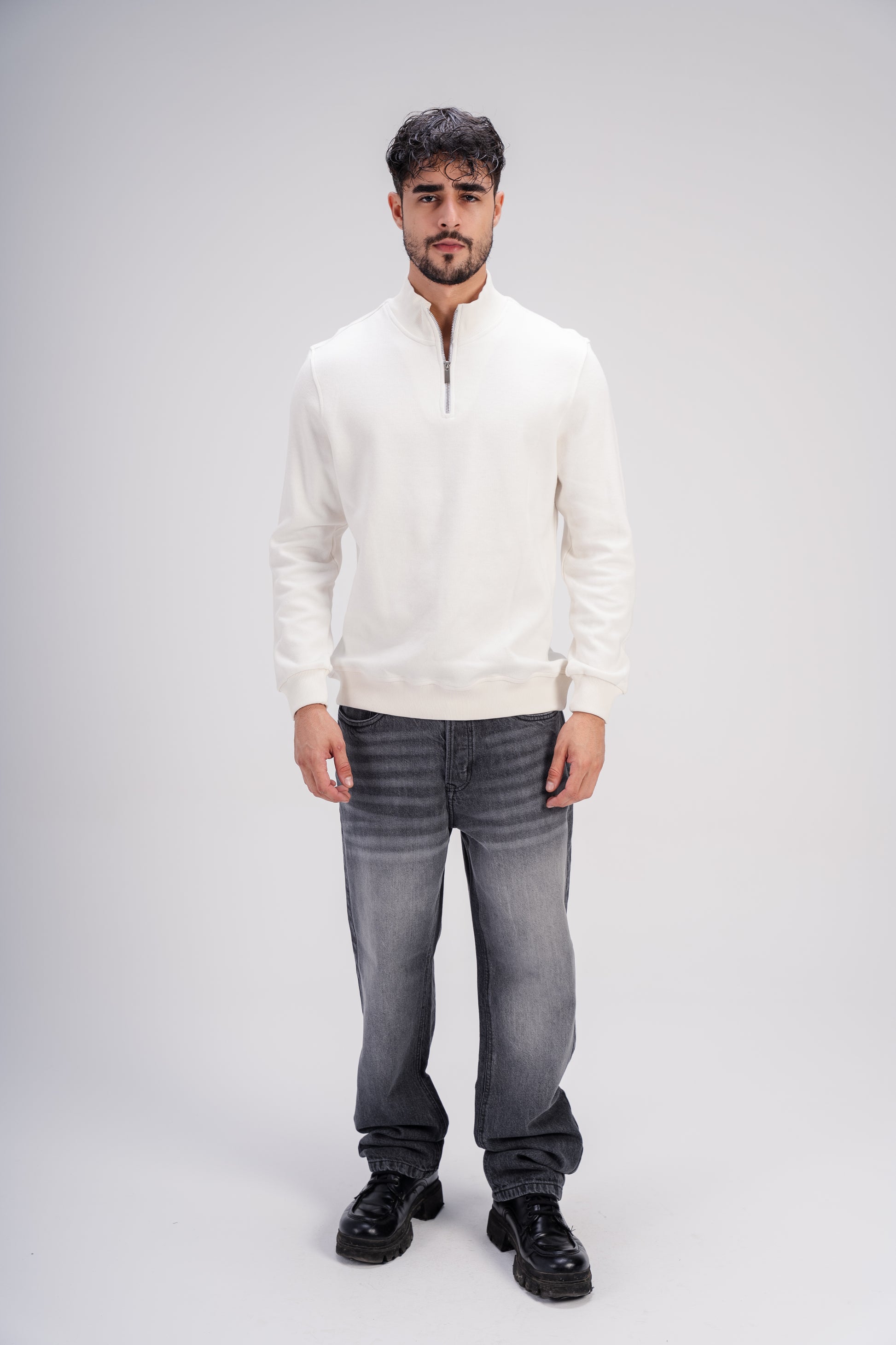 The white quarter-zip sweater boasts a design that combines contemporary style with ultimate comfort. Lined with soft fleece, it offers a cozy feel against the skin while the sleek exterior adds a modern edge. This versatile piece features a relaxed fit, making it perfect for layering or wearing solo. The combination of the stylish silhouette and plush interior makes this sweater a must-have for any casual wardrobe.
