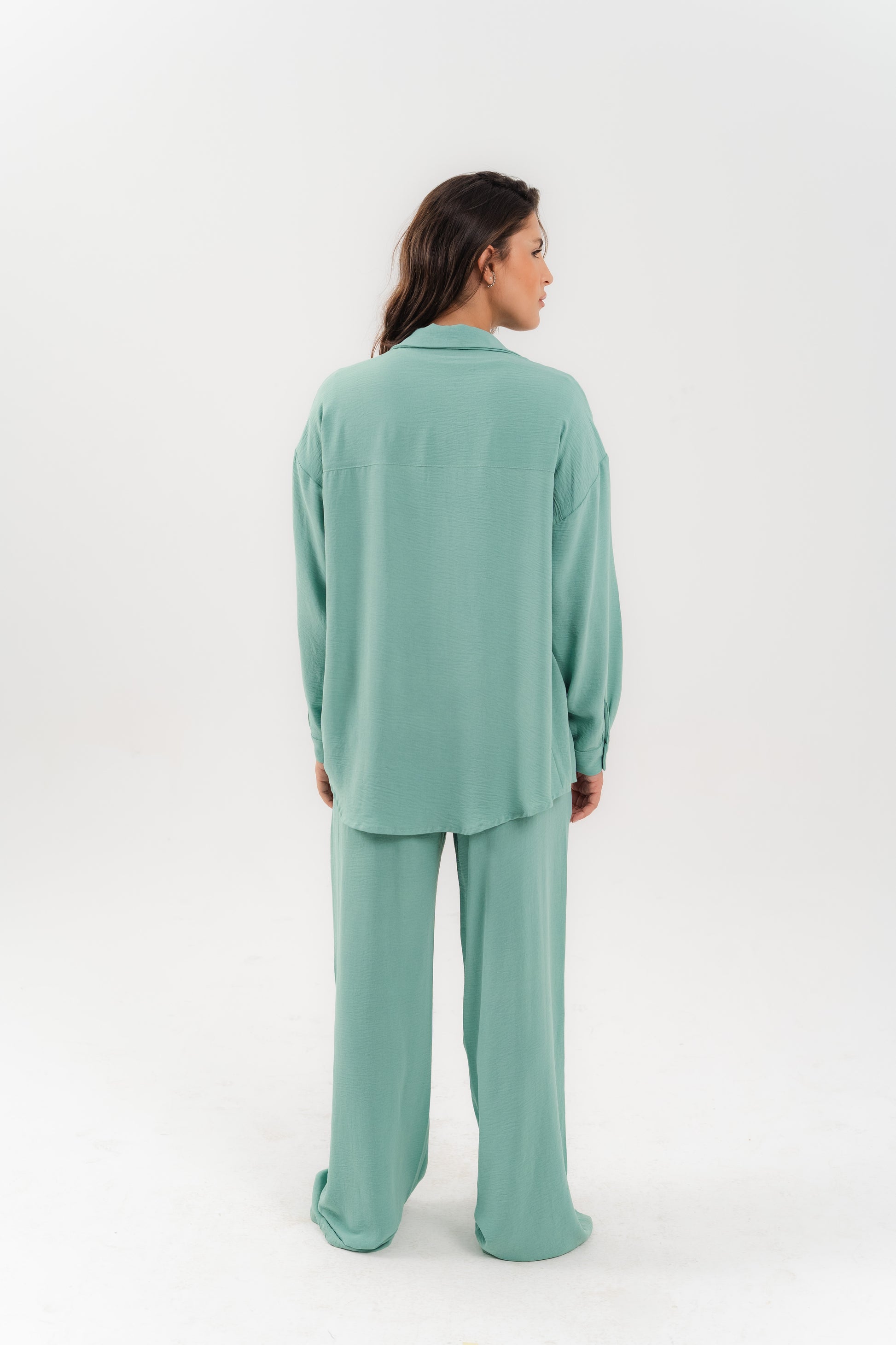Step into effortless sophistication with the KNTD Luxe Lounge Co-Ord Set in Soft Sage. This elegant two-piece ensemble features a relaxed button-down shirt paired with flowing, wide-leg pants designed for all-day comfort without compromising on style. Crafted from a premium, lightweight fabric, it offers a refined drape and breathable ease — perfect for serene mornings, chic resort lounging, or elevated travel looks.