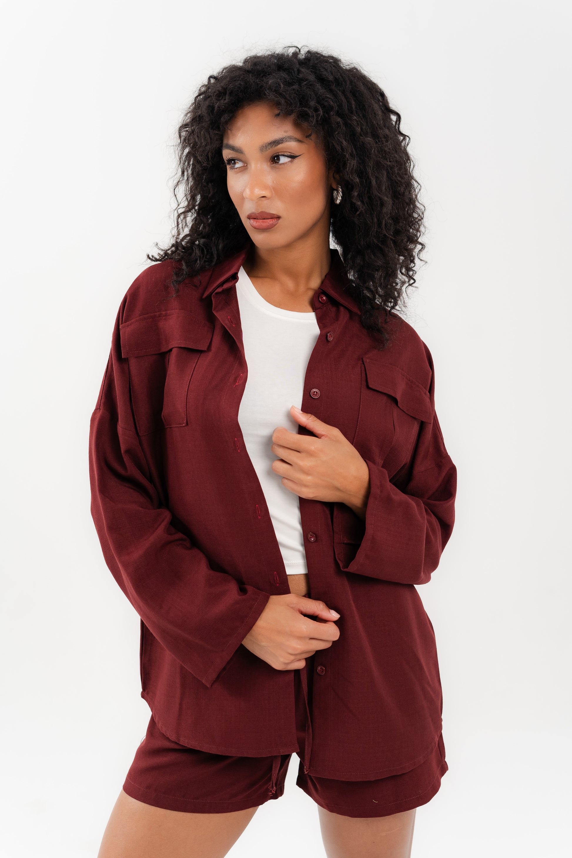Elevate your loungewear game with this effortlessly chic 2-piece burgundy set. Featuring a relaxed-fit button-down shirt, soft elastic-waist shorts with utility-style front pockets, this set is designed for both comfort and style. Made from breathable, lightweight fabric, it’s perfect for cozy days at home or laid-back outings. Minimalist, modern, and endlessly versatile — wear the pieces together or mix and match for endless looks.