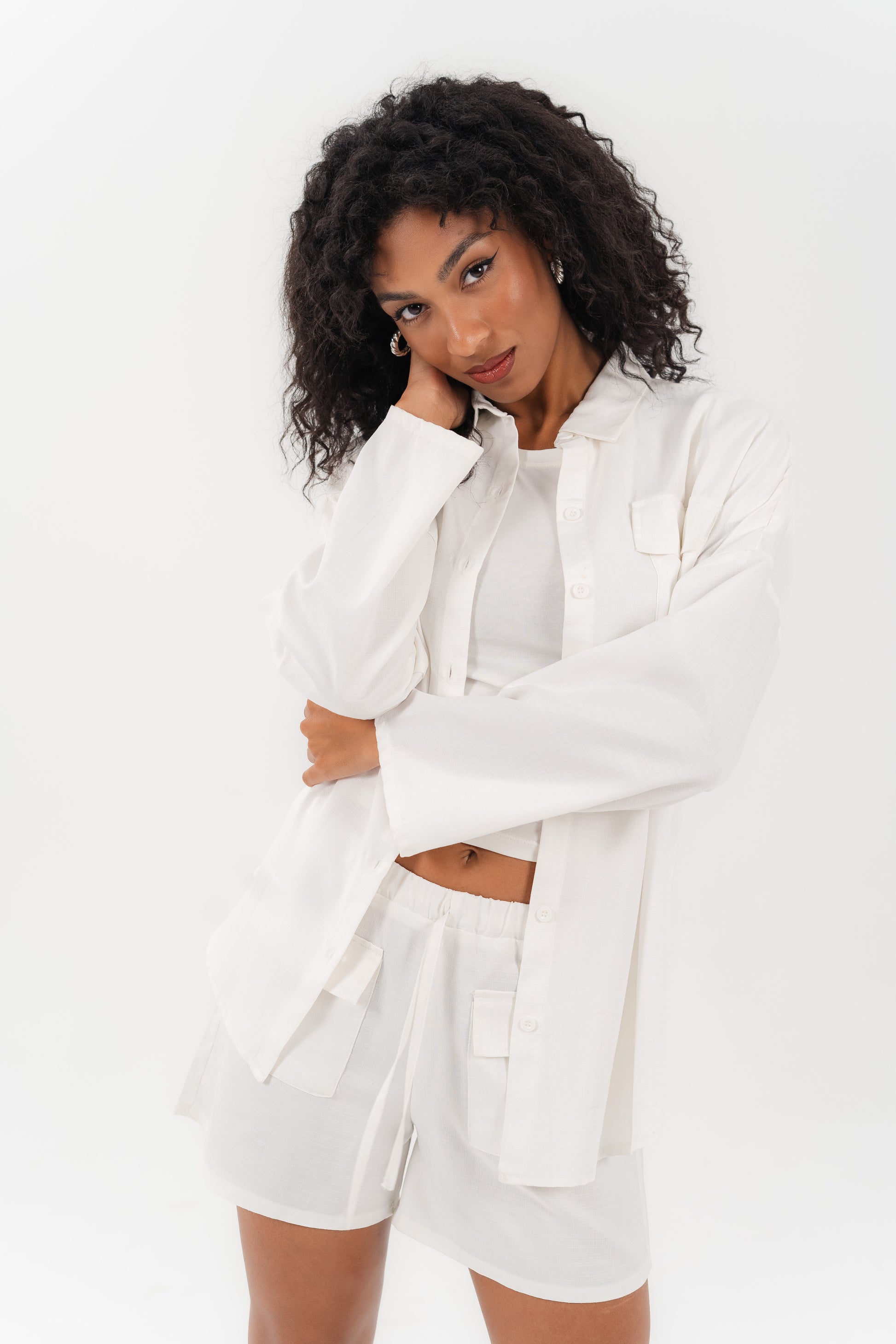 Elevate your loungewear game with this effortlessly chic 2-piece white set. Featuring a relaxed-fit button-down shirt, soft elastic-waist shorts with utility-style front pockets, this set is designed for both comfort and style. Made from breathable, lightweight fabric, it’s perfect for cozy days at home or laid-back outings. Minimalist, modern, and endlessly versatile — wear the pieces together or mix and match for endless looks.