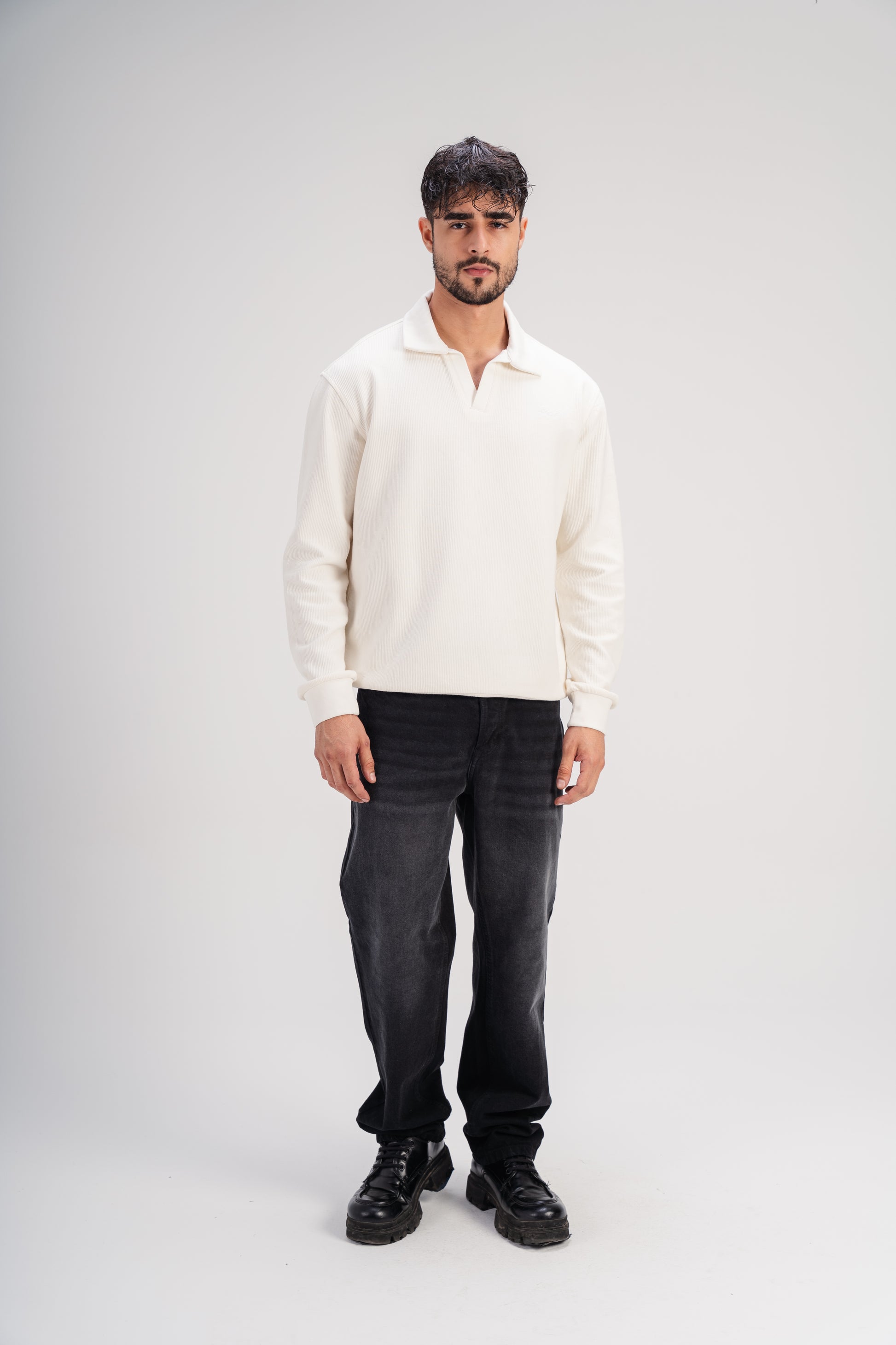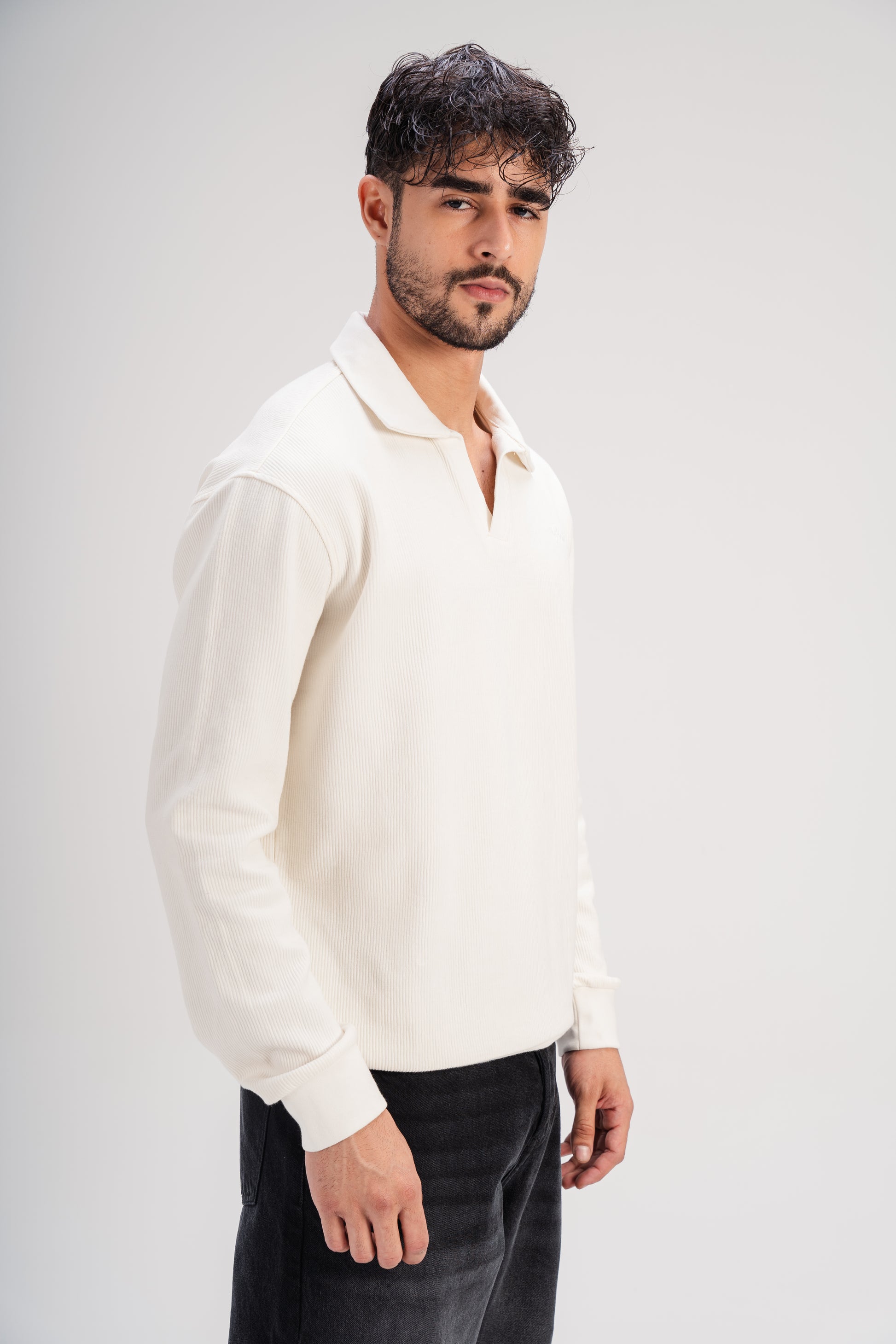 White long-sleeve T-shirt featuring an open collar design for a clean, modern look. Made from soft, comfortable fabric with a smooth cotton-like texture, it offers a relaxed fit and a straight hem—perfect for versatile, everyday styling.