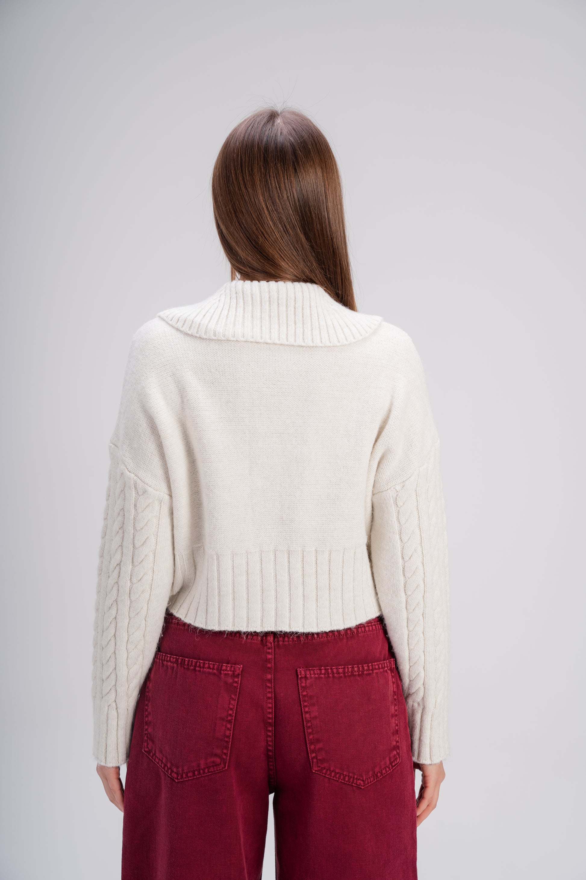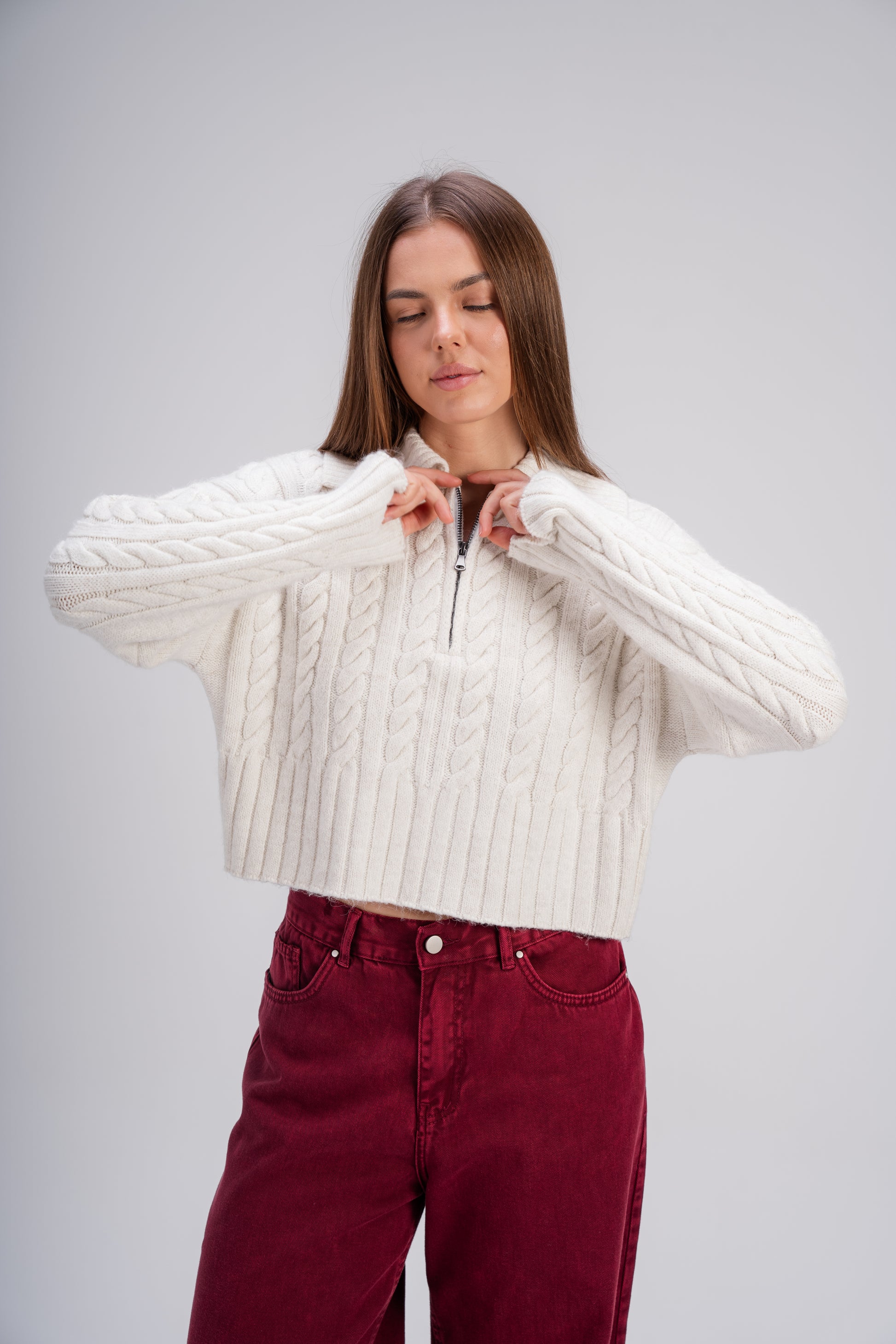 Stay cozy and stylish with this white ribbed knit sweater. Designed with a soft cable pattern, a short zip-up front, and a folded collar for a modern touch. The cropped fit adds a trendy edge, making it perfect to pair with high-waisted jeans or skirts. A comfortable and chic choice for cool-weather days.