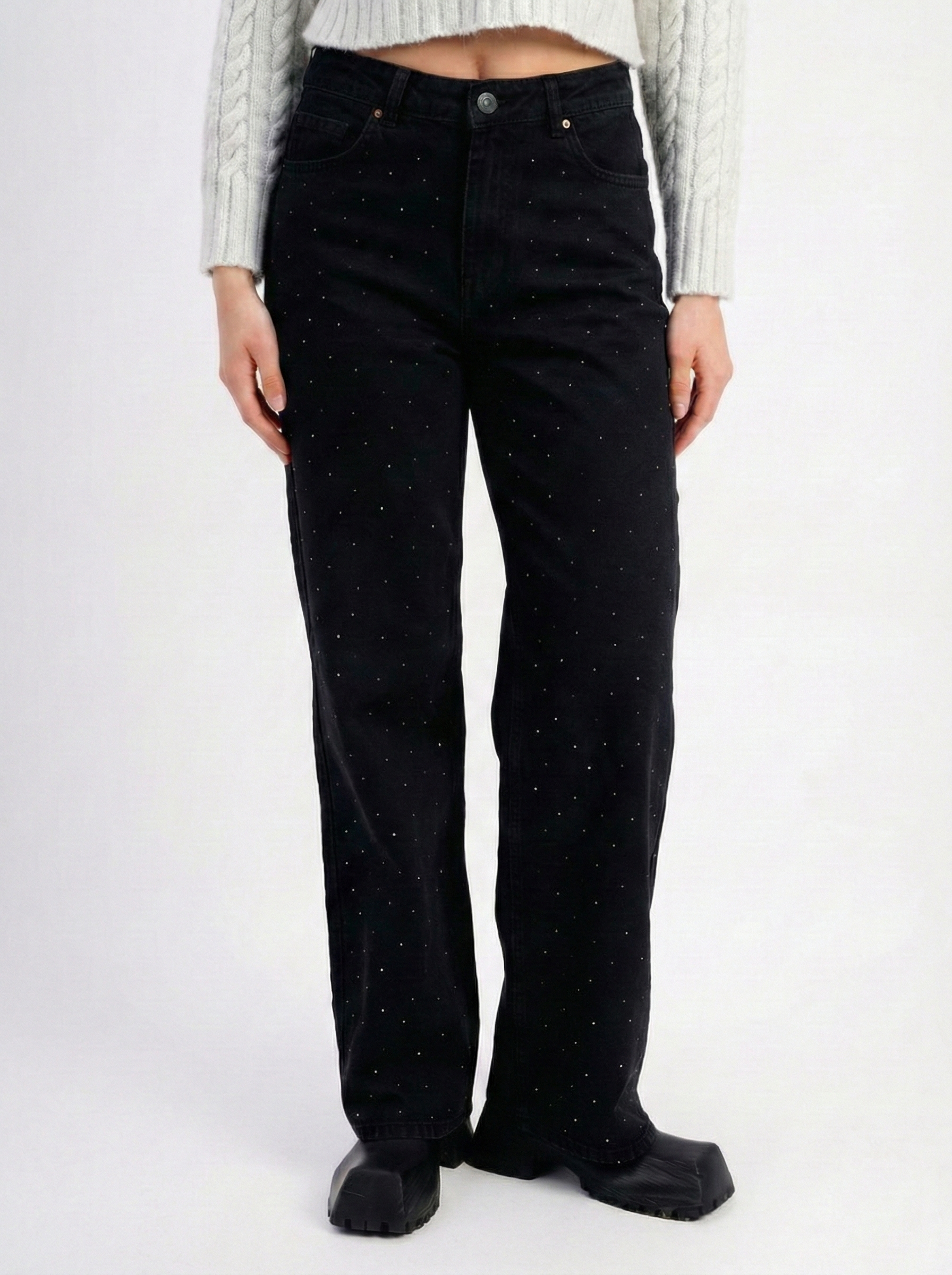 Crafted from a structured yet comfortable , these pants are designed to sit high on the waist, elongating the legs and providing a flattering, secure fit. The subtle "stardust" crystal detailing catches the light with every movement, making them the perfect transition piece from a casual day out to a festive evening event.