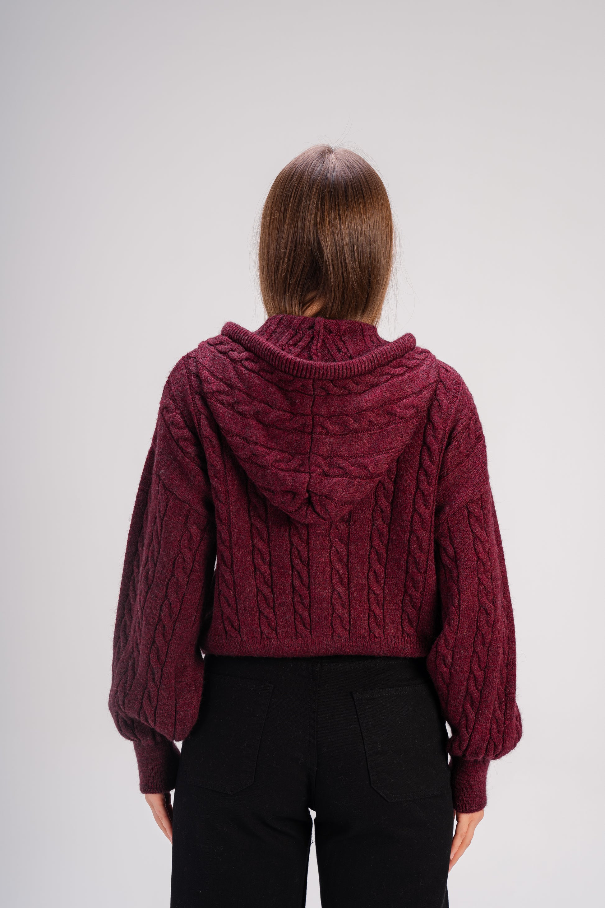 Stay cozy and effortlessly stylish with this women’s cable knit zip hoodie in a rich deep burgundy shade. Crafted from soft, warm fabric, it features a classic cable-knit texture, full front zipper, and a relaxed cropped fit for a modern twist. Perfect for layering over your favorite tops on cool days, combining comfort and elegance in one piece