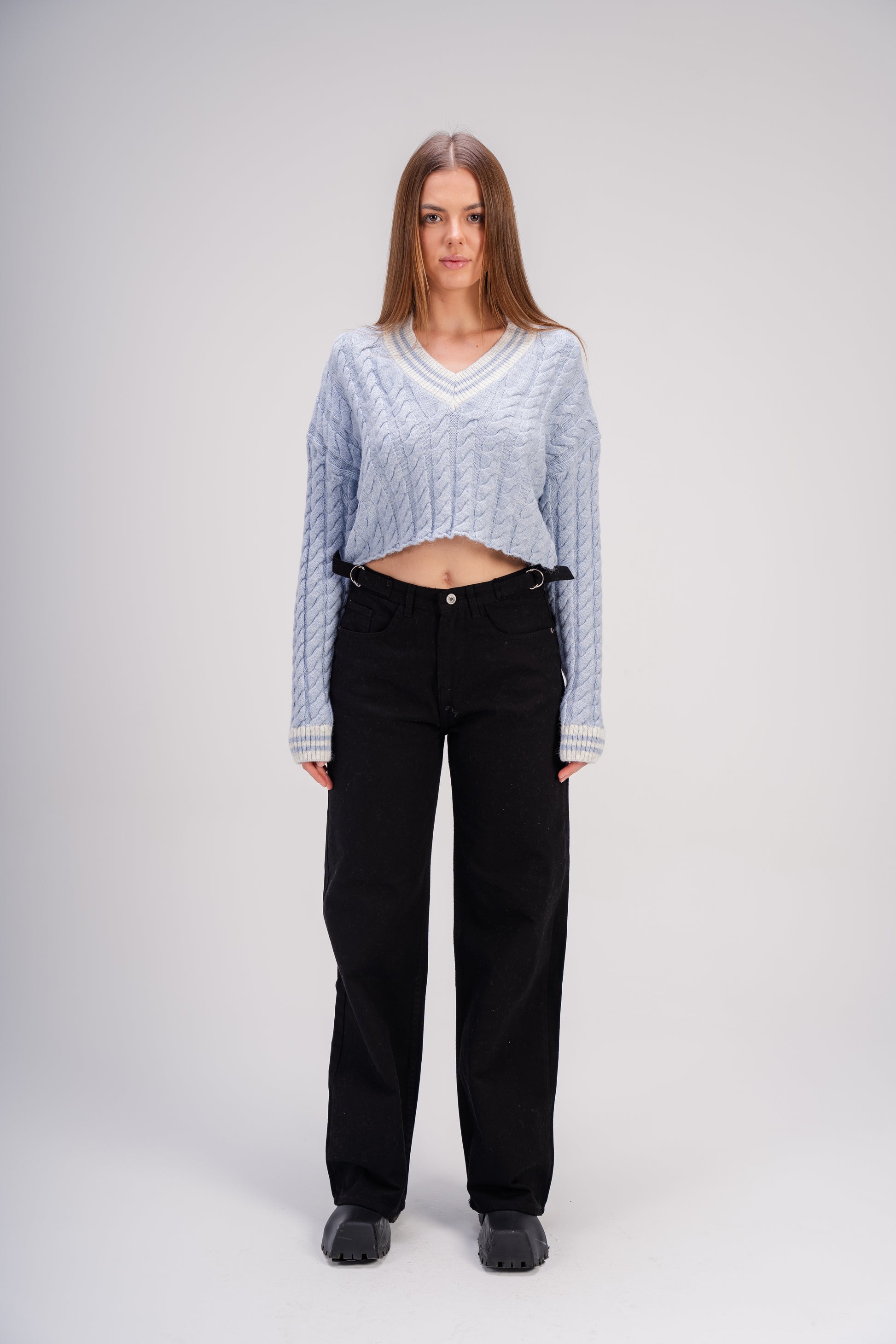 Add a touch of elegance and warmth to your look with this women’s cropped cable knit sweater. Made from soft, cozy fabric, it features a classic V-neck design with white -trimmed edges for a refined and feminine touch.